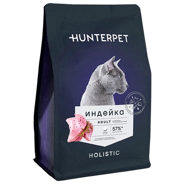 Пакет корма HUNTERPET создаёт впечатление премиального продукта благодаря приятной на ощупь бархатистой текстуре верхнего слоя и стильному оформлению. Дизайн пакета корма Hunterpet «Индейка для стерилизованных кошек» выглядит довольно строго. Чтобы подчеркнуть элитарность, производитель выбрал черный фон с серебристыми акцентами. Кошка породы русская голубая, которая выбрана в качестве «героини» для этой упаковки, отличается красивой блестящей серебристо-голубой шерстью. Это довольно выгодный с точки зрения маркетинга подход, ведь на фоне аляповатых ярких пакетов такие продукты смотрятся более стильно.
